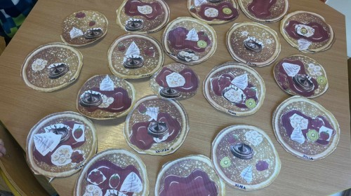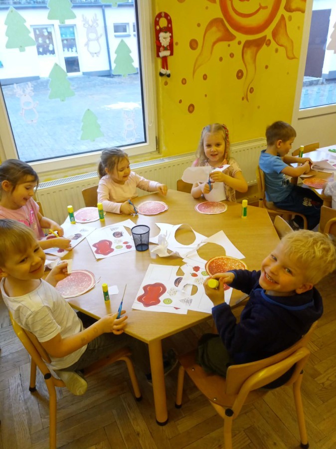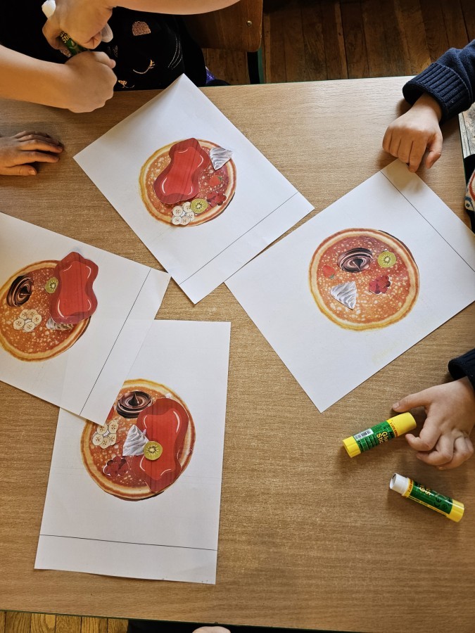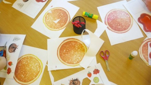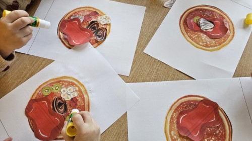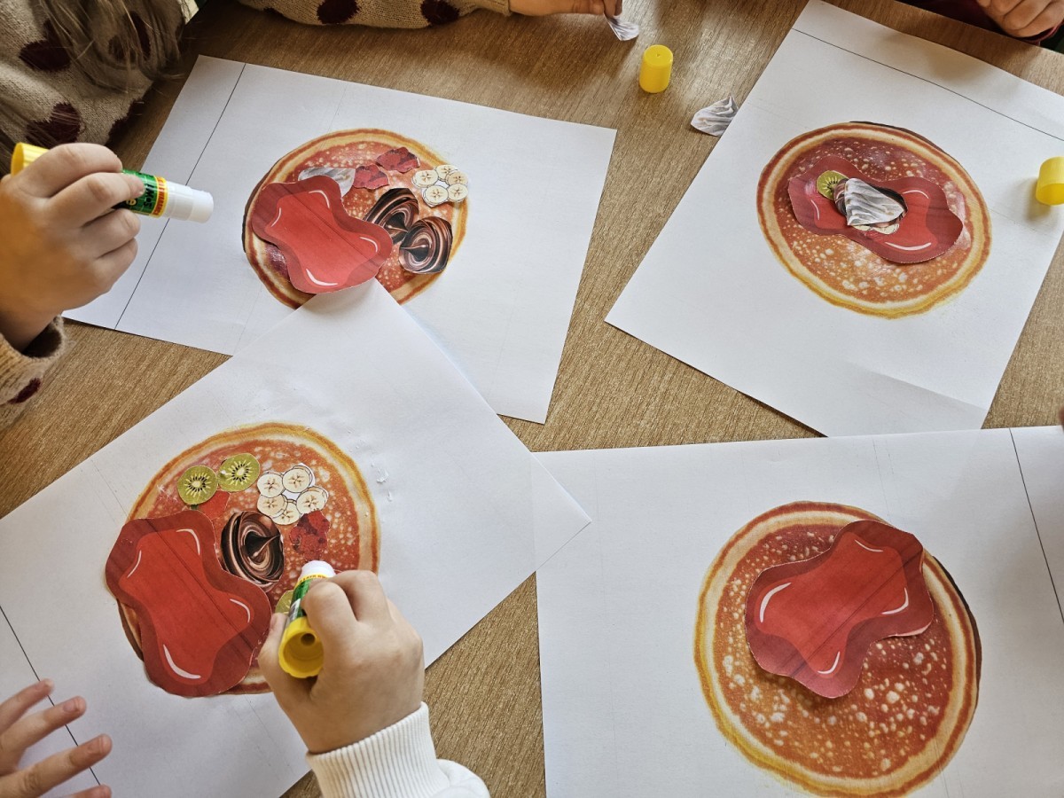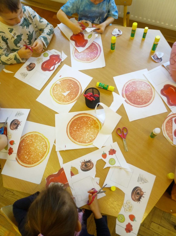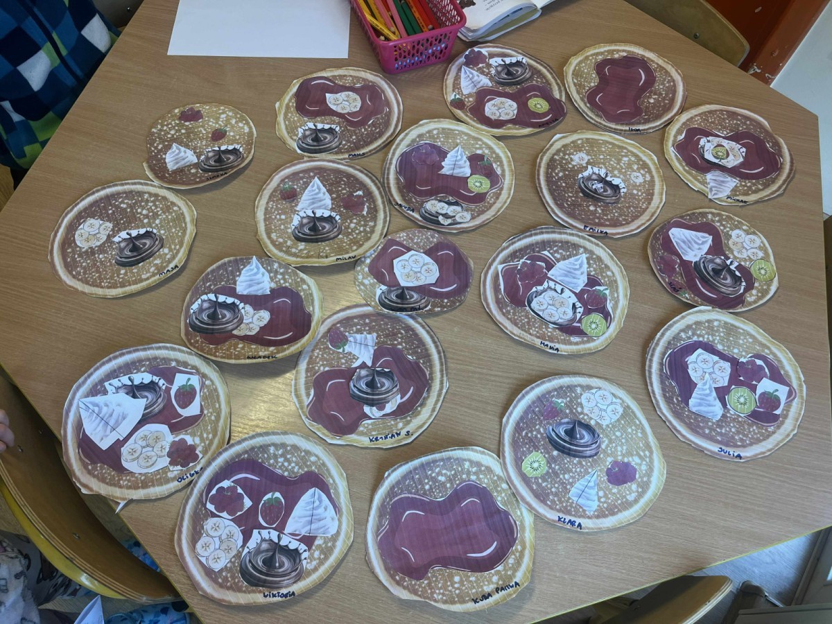 Na zakończenie wykonaliśmy prace plastyczne. Z papieru wyklejaliśmy naleśniki z dodatkami, które lubimy najbardziej.