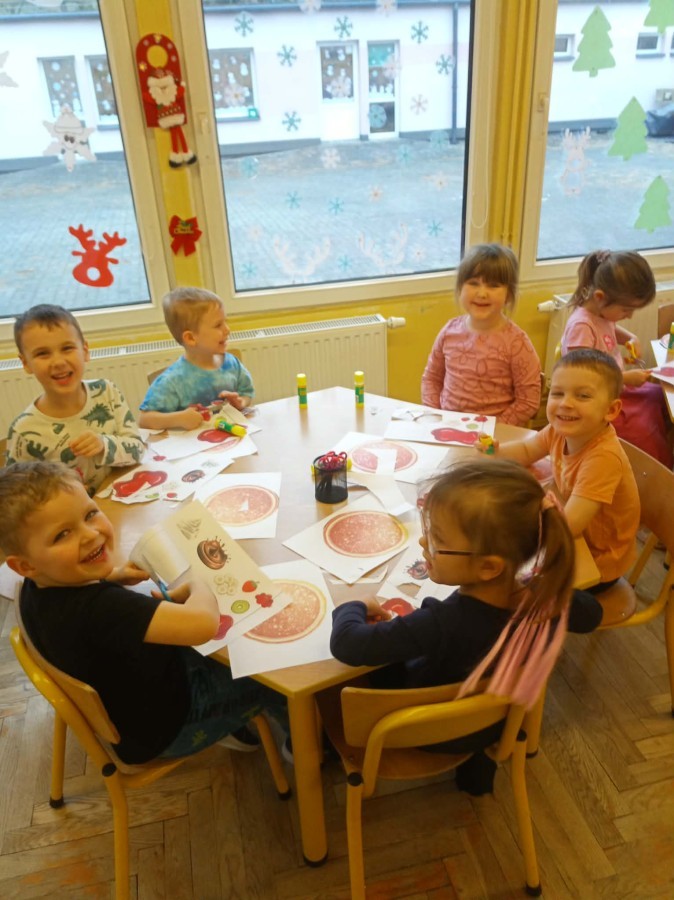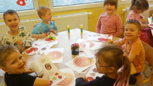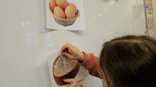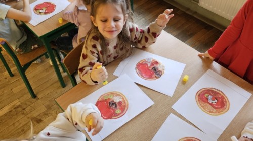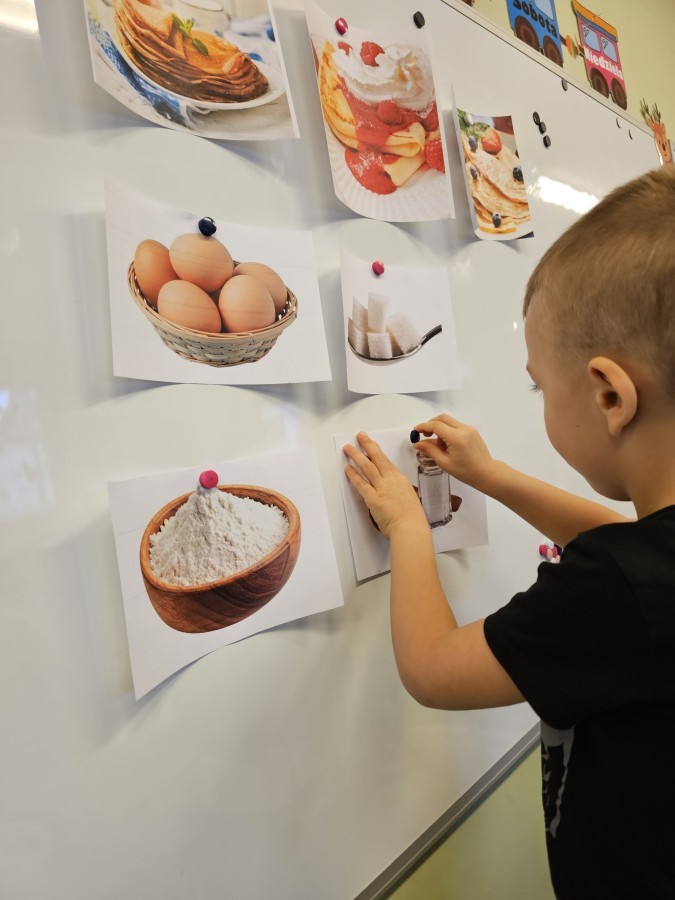 Dowiedzieliśmy się także, jak powstają naleśniki i jakie produkty są potrzebne do ich przygotowania. Dzieci z łatwością wymieniały składniki i chętnie dzieliły się swoimi doświadczeniami z przygotowywania ciasta naleśnikowego w domu. Podczas zabawy ruchowej każdy z nas zamienił się w naleśnika, co sprawiło nam mnóstwo śmiechu.