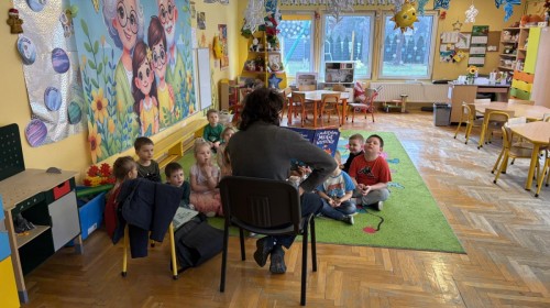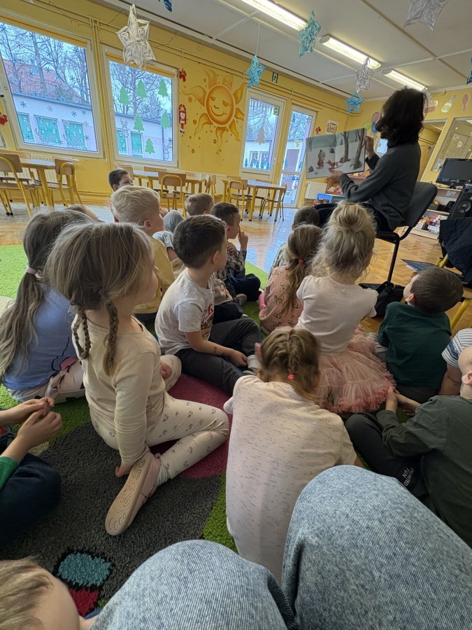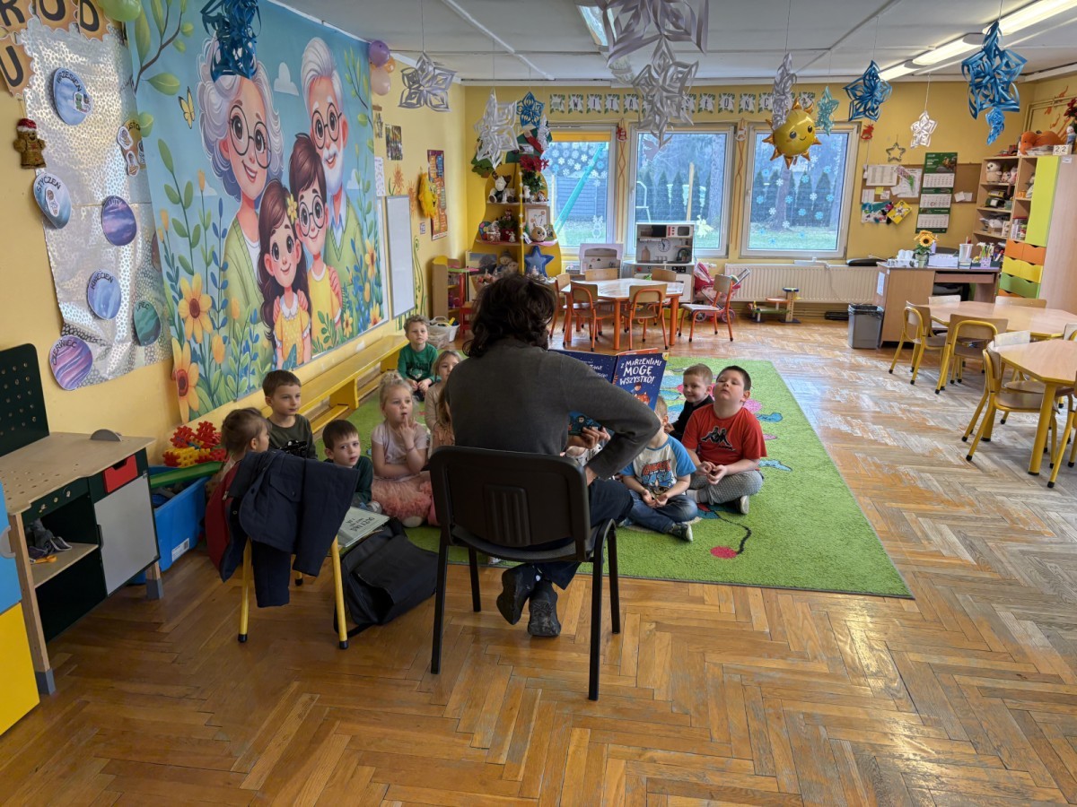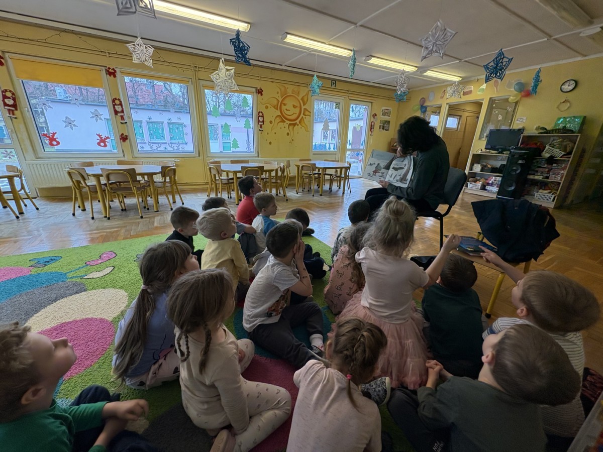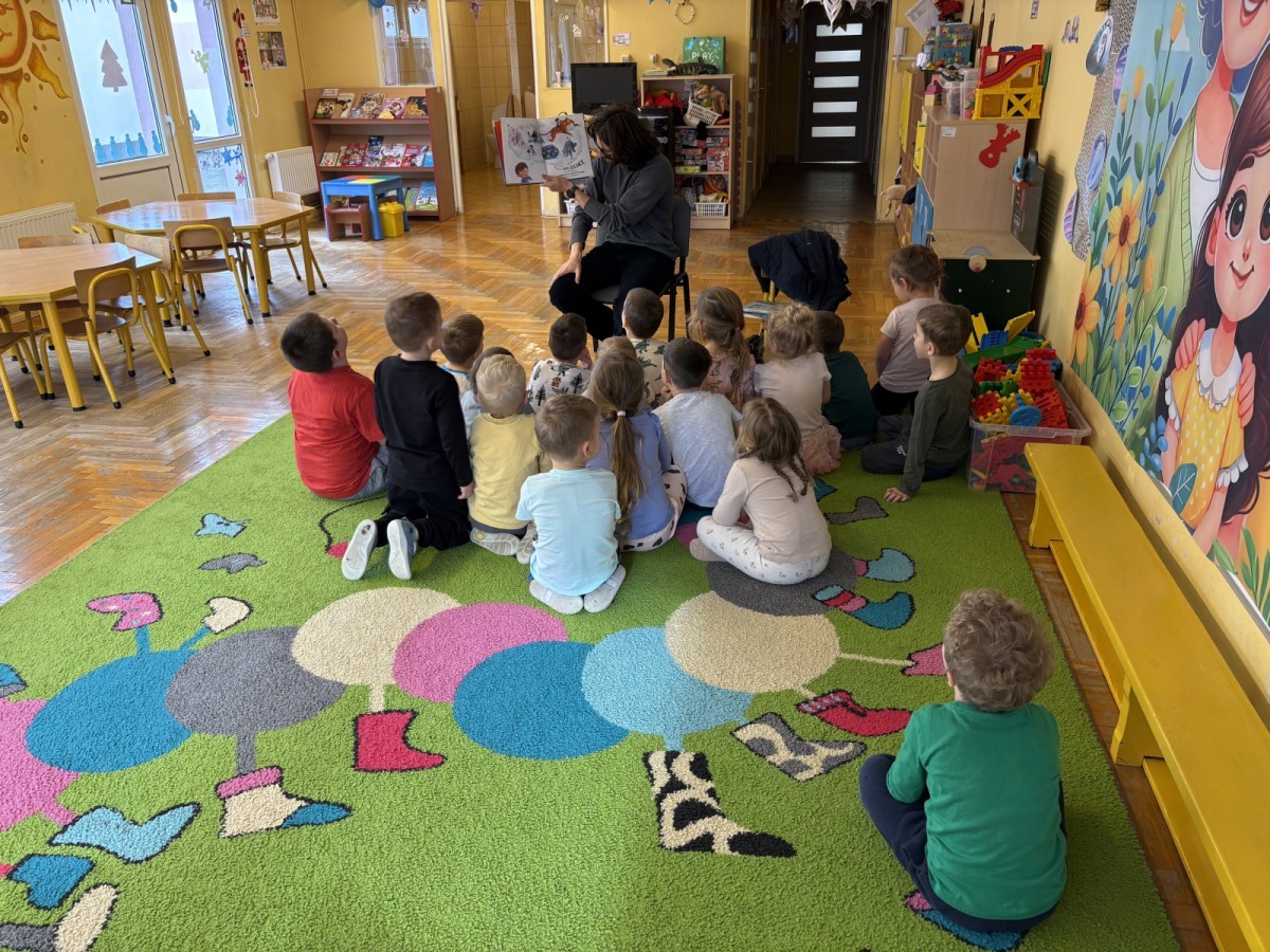 W minionych dniach w naszej grupie przedszkolnej odbyło się spotkanie czytelnicze w ramach współpracy z biblioteką. Dzieci z zainteresowaniem wysłuchały czytanych opowiadań i bajek, które przeniosły je w świat wyobraźni i przygód. Podczas spotkania przedszkolaki aktywnie uczestniczyły w rozmowie na temat bohaterów oraz wydarzeń zawartych w książkach, chętnie dzieląc się swoimi spostrzeżeniami.
